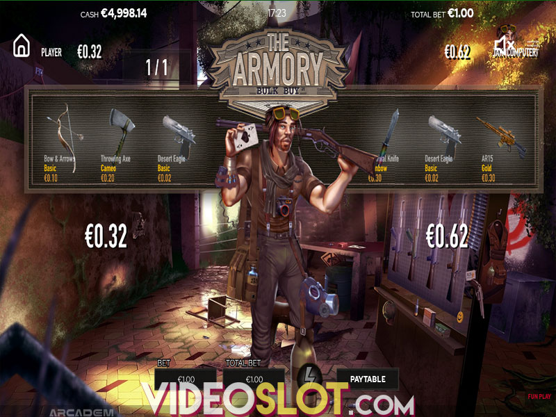 As mentioned, the slot is packed with all sorts of weaponry, so fans will have a field day while playing. You’ll be looking at various types of Guns, Knives, Riffles, Axes, Bow and Arrows, as well as Shotguns. Over 30 symbols award values between $0.02 and $100.00 for each icon on the winline.