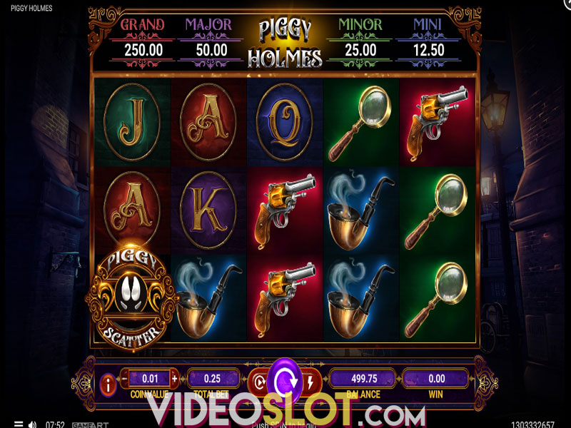 Dark streets of London are waiting for you, along with a dramatic soundtrack, but don’t get scared once you start playing, because Piggy Holmes is there to watch your back. Piggy Holmes is the Wild that substitutes for all regular icons. There is the Piggy Scatter that triggers free spins, and the Golden Piggy Coin, in charge of activating the Piggy Respins feature. As for regular symbols, players will come across Revolvers, Handcuffs, Magnifying Glass, Pipes, and four playing cards.