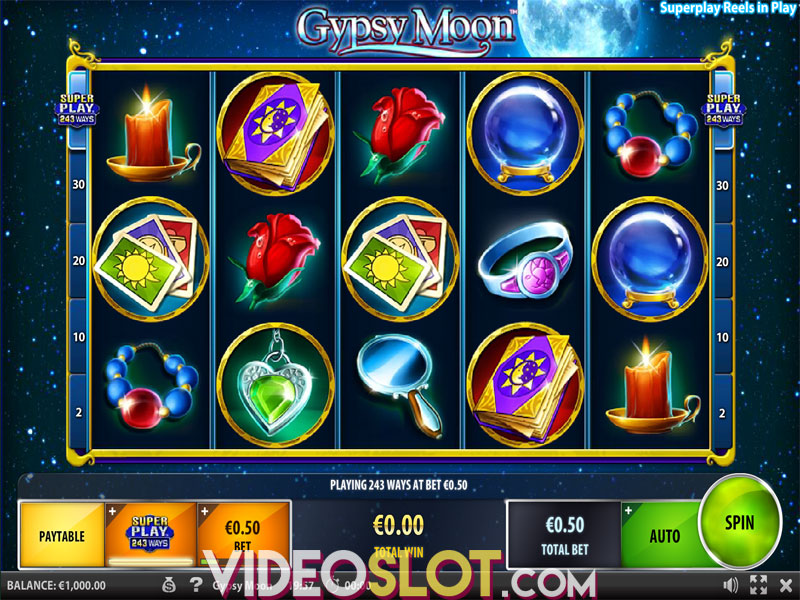Are you curious about your future and destiny? Give the Gypsy Moon slot a try to hear what a beautiful fortuneteller has to tell you and you can hit some nice winnings on top. The IGT 2017 slot release will take you to a Gypsy caravan where your host will be a blue-eyed clairvoyant and you may be spellbound by all the items she uses to foretell your destiny and the overall mysterious atmosphere of the game. Offering the top fixed jackpot of 10,000 coins, Gypsy Moon uses 30 adjustable paying lines and provides you with the possibility of activating the SuperPlay mode with 243 ways to win.