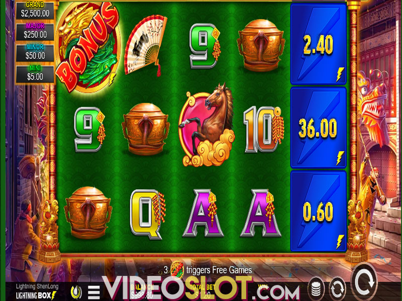The reels are set on the streets of a traditional village in China. The festivities celebrating the mighty Shenlong Dragon are on their way, so you will enjoy the show performed by artists, as well as the soundtrack in the background. Shenlong is the Wild that substitutes for all regular symbols. The Lightning Bolt is the Scatter that triggers Lightning Respins. The Dragon Scatter is there to help you trigger free spins. Among regular symbols, you will find the Golden Ox, the Tiger, Horse, Hand Fan, and a Pot. Playing cards are used for low-paying icons.