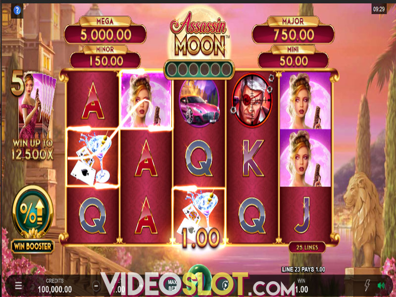The Moon Assassin slot takes you to Monte Carlo with the reels set against a luxurious private villa. The graphics are well done, while an uplifting music score will keep you engaged as you spin the reels. The man with a target across his face, sportscar, a Martini with playing cards and dice pay high-value prizes. Playing card royals make up the lower ends of the paytable. The protagonist of the slot, Luna, assumes the role of Wild. There is also the full moon symbol and the casino chip representing Scatter.