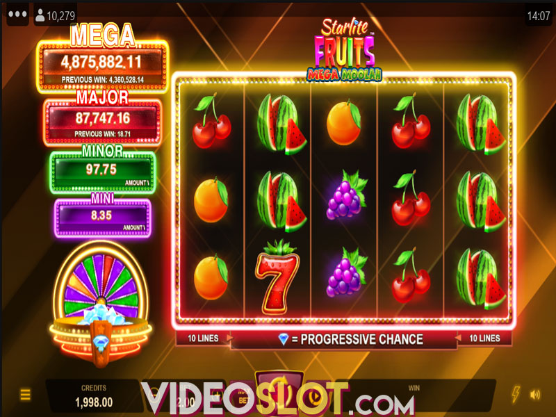 All symbols on the reels are theme-related, so you’ll be looking at Grapes, Cherries, Oranges, Lemons and Watermelons on the lower part of the Paytable. When 5 of the same type appear on consecutive positions you’ll receive from 2.50x to 6x the bet. Two top-paying symbols are represented with a Strawberry Seven and a Golden Bar Apple which grant 12x and 25x your stake respectively for 5 of a kind. Star fruit stands for Wild that replaces all symbols but the Diamond. Wild only lands on reels 2, 3 and 4 and is in charge of triggering more than one benefit. Another special symbol in the game is the Diamond which activates the Progressive Wheel.