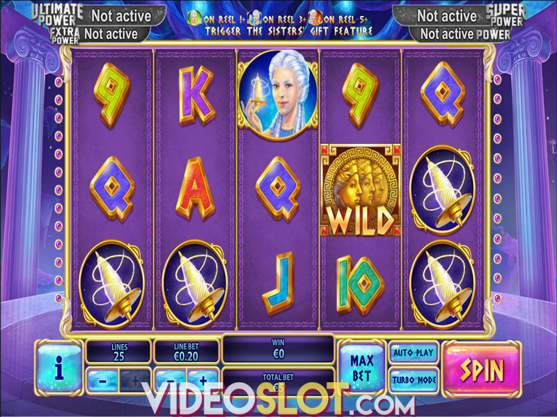 The Fate Sisters slot is a medium variance game with multiple opportunities to win and it will please all kinds of players as it allows placing bets from only $0.25 up to staggering $2,500 per spin. The possibility of hitting a progressive jackpot increases the anticipation while playing this game, but if you don't succeed, there is always a chance of winning the 500 coin top fixed prize. Not much, but the rewarding bonus features which can be triggered at any point of the game still make the game worth your time and money.