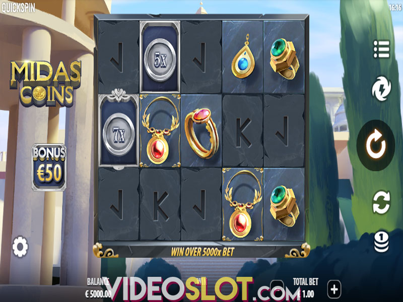 Midas Coins online slot tells the legend of a greedy Greek king who desired everything he touched to turn into gold. His wish was granted at a high cost, but in this title we see this story end differently, with many a feature working to our advantage. Rolled out in April 2021 by Quickspin software provider, this game is done in their recognizable style, with premium graphics and epic soundtrack. Payouts of up to 500,000 coins can be obtained via Marigold Wilds, Midas Symbols, a Free Spins Round and a Buy Feature. The RTP is placed at an average 96.02%.