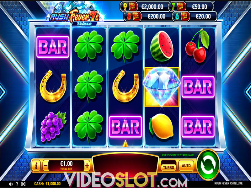 This fruity title has an array of juicy symbols on display, so there will be plenty of Cherries, Lemons, Plums, Grapes and Watermelons on the screen. These fruits represent low-value symbols that award 0.50x your stake when 5 of the same type form a win combination. The reels are also home to Clovers, Horseshoes, Bells, Single Bars and Triple Sevens which stand for Premiums. If 5 matching ones hit, you will receive between 0.70x and 10x the bet. The Triple Sevens icon also issues payouts for merely 2 of a kind. Wild, depicted with a Diamond, lands on three central reels to replace all other symbols but Rush Fever. The Star is Scatter that not only activates Free Spins but grants 2x, 4x and 20x the stake when 3, 4 or 5 appear.