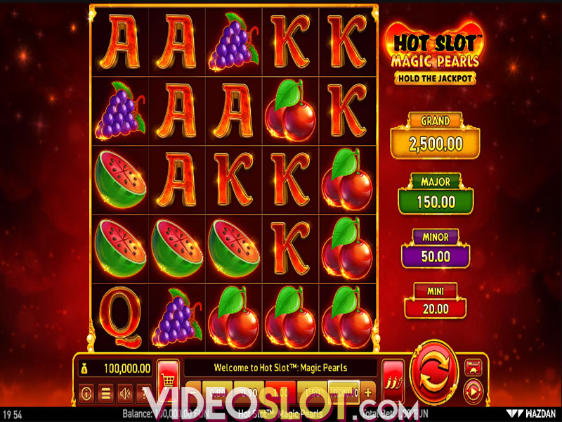Premiums include Cherries, Grapes, Oranges and Watermelons delivering from 50x to 200x the wager if 22 land. Playing card Royals are low-win symbols that award between 10x and 30x your bet when 22 or more hit the grid. Wild appears on all reels to complete win combos by replacing all other icons but Bonus. These Bonus icons are represented with Pearls that carry cash values of up to 10x the stake and can land anywhere on the layout. These are in charge of triggering the Hold the Jackpot Feature.